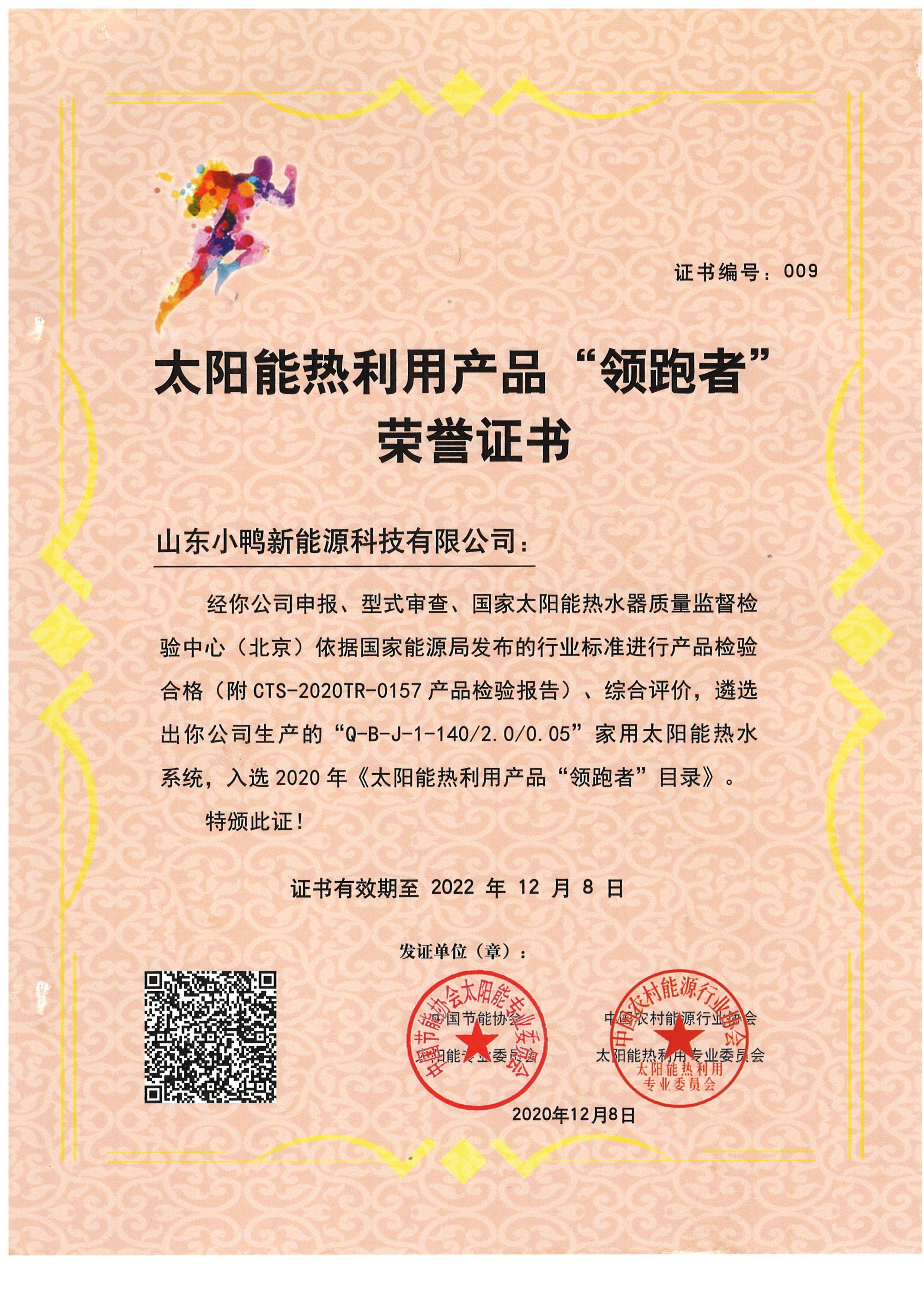 12月8日下午,“2020年中國(guó)太陽(yáng)能熱利用行業(yè)”領(lǐng)跑者”產(chǎn)品及企業(yè)名錄”發(fā)布,小鴨新能源家用熱水系統(tǒng)入選2020年《太陽(yáng)能熱利用產(chǎn)品“領(lǐng)跑者”目錄》。